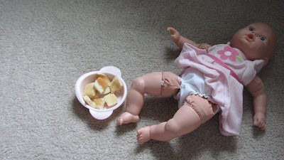I couple of days ago I had an early appointment and was really rushing trying to get two kids and myself ready. I kept telling Evelyn over and over again to "eat your pancake" and she kept saying "no". When it was time to leave I realized there was no more pancake on her plate, which I was very happy about because that meant she ate it...or so I thought. AFTER we got back I found this...